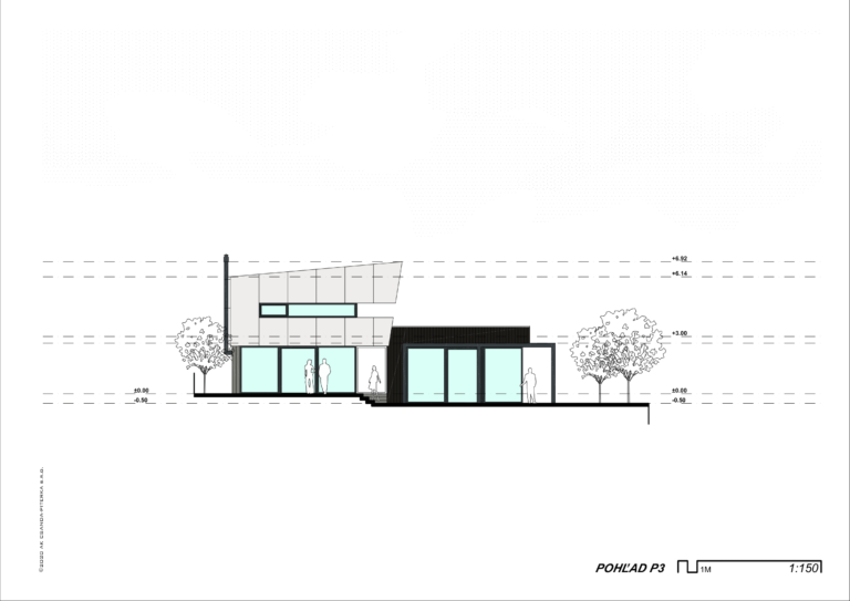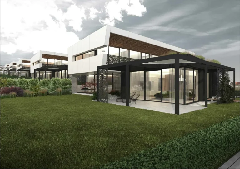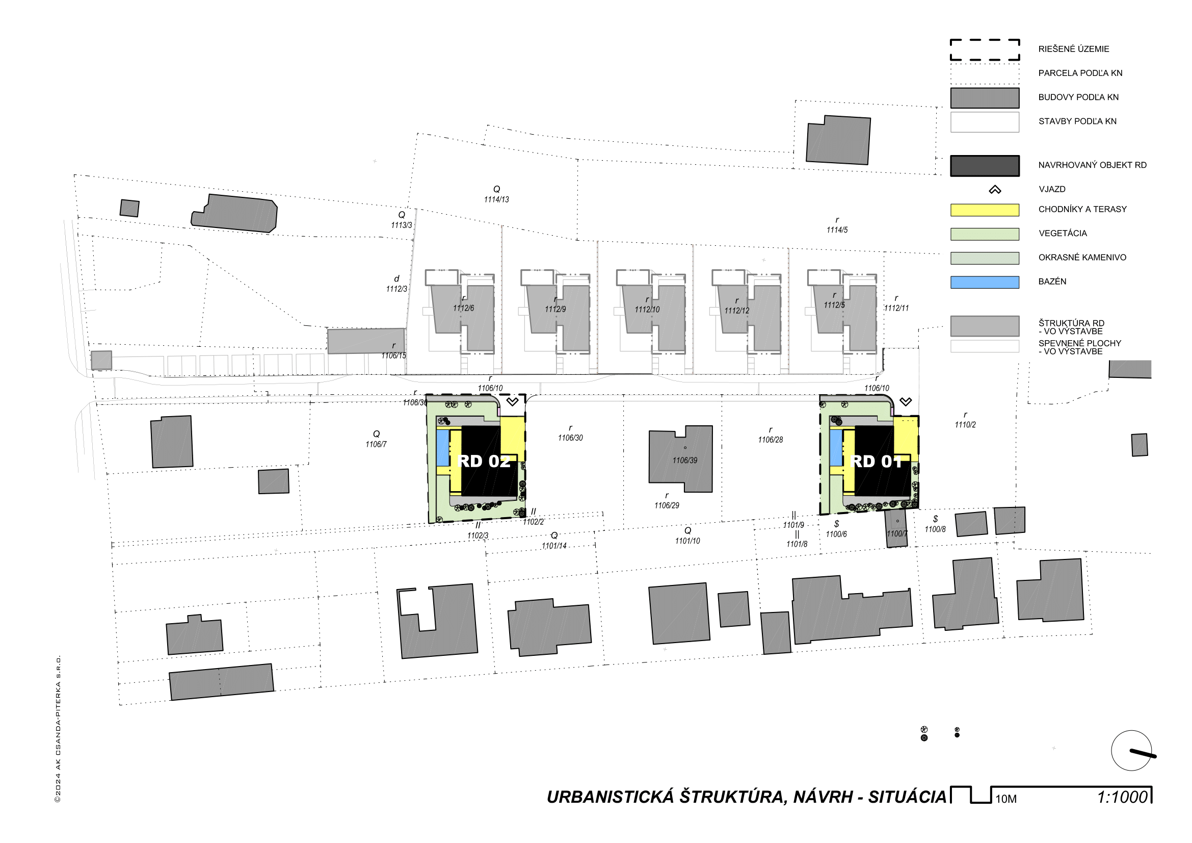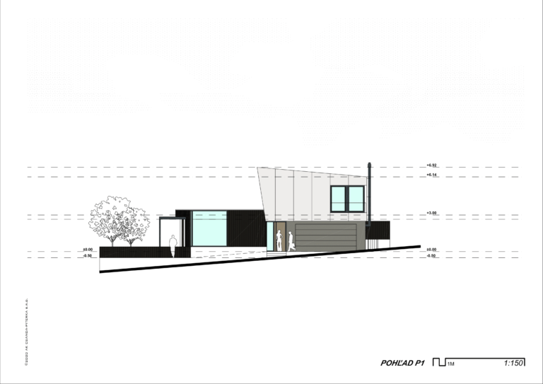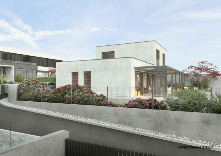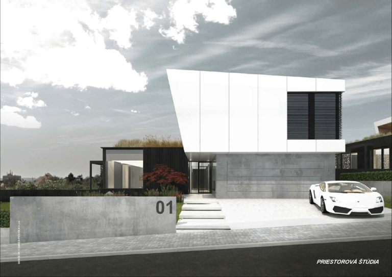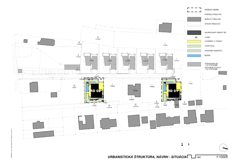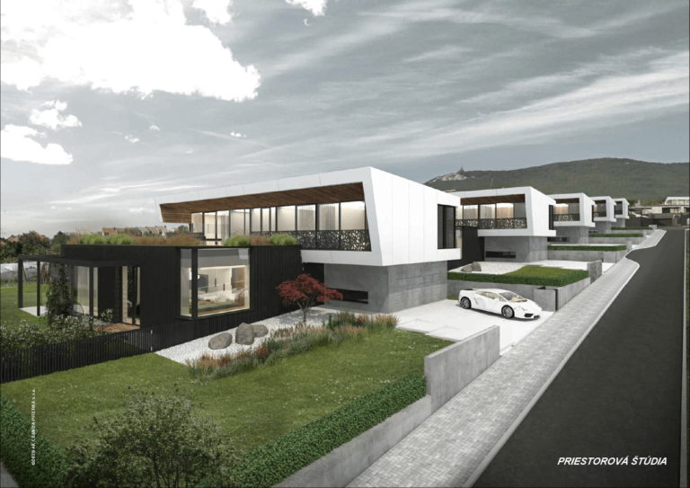 Rodinné domy sú dvojpodlažné objekty terasovito stúpajúce pozdĺž cesty. Tvar domu je vytvorený z troch hmôt, ktoré sú materiálovo odlíšené. 1NP je tvorené z hmoty dennej časti, ktorá je obložená fasádnym systémom vertikálnych lamiel a oproti ostatnej časti 1NP je posadená nižšie o 0,5m. Druhá časť tvorí podnož pre 2NP a je z pohľadového betónu. 2NP je obložené z dosiek alucobond. Zošikmenie jednej z fasád a strechy dodáva kompozícii dynamickosť a odpovedá na pôdorysné vytočenie steny dennej časti. Pôdorysný tvar dennej časti reflektuje možné výhľady na mesto. V súkromnej časti záhrady lemuje dennú časť pergola, ktorá prekrýva a zintímňuje priestory terás. Hmota 2NP prekrýva hlavný vstup od ulice, tak aj od záhrady ďalšiu terasu prístupnú zo spálne. Strecha dennej časti je navrhnutá ako zelená strecha s terasou, ktorá je prístupná z loggie pozdĺž celej dispozície 2NP. Loggia je orámovaná hmotou 2NP. Domy sú vyššieho štandardu čo je zrejmé z použitých materiálov (sklo, pohľadový betón, veľkoformátové obklady).