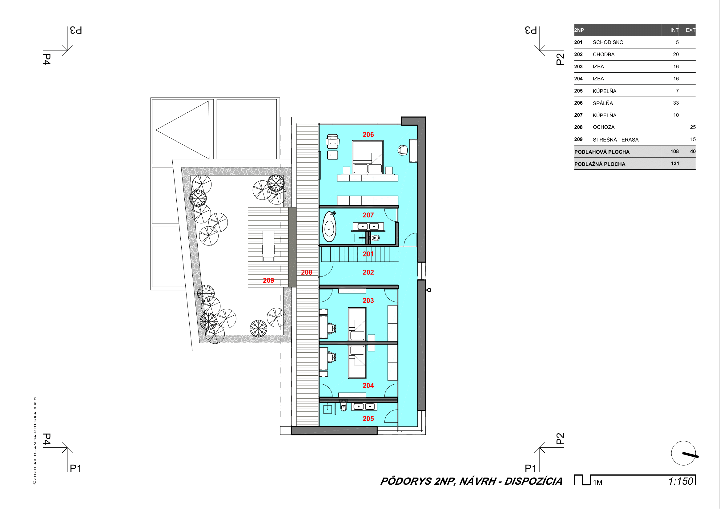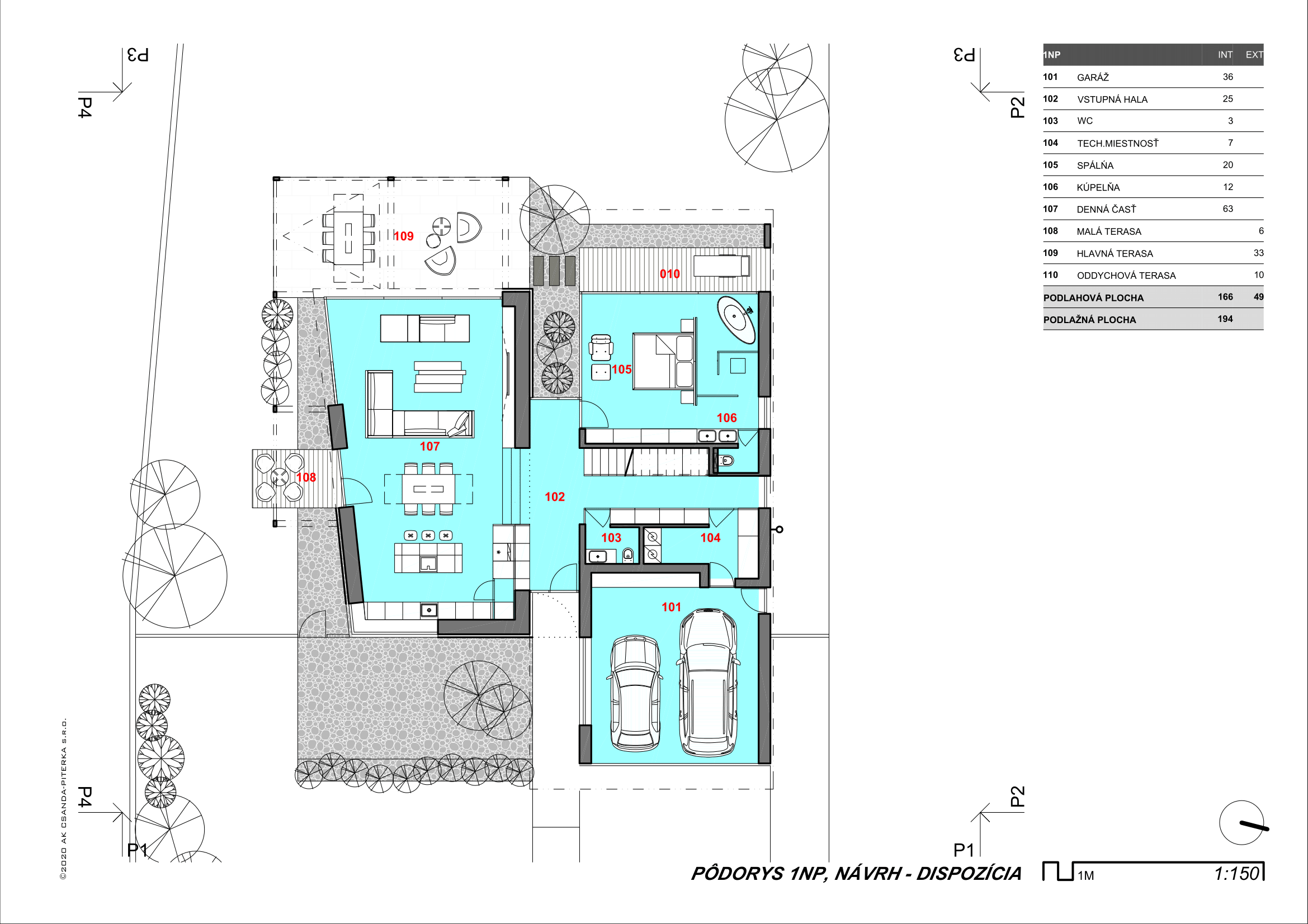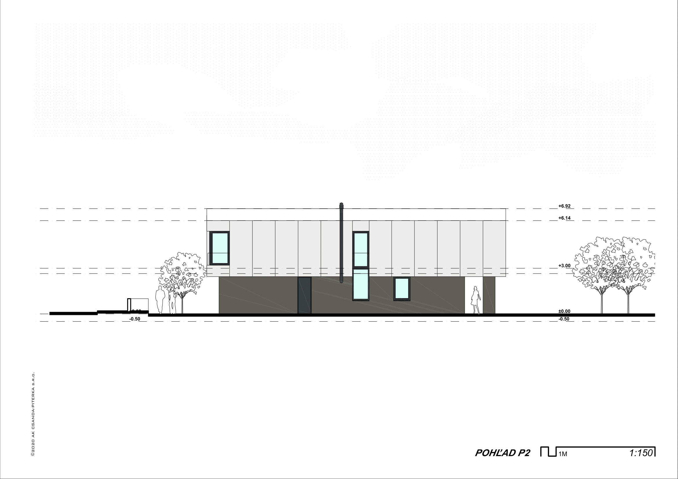 1NP domu je prístupné od ulice kde je aj parkovanie a vjazd do garáže. Zo vstupnej haly so schodiskom na 2NP je prístup do WC, tech. časti domu a garáže, Na opačnej strane je prechod do dennej časti. Z jedálenskej časti je vstup na malú terasu. Z obývacej časti je prístup na hlavnú-spoločenskú terasu. V závere haly je átriový vonkajší priestor, pred ktorým je vstup do spálne so samostatnou kúpeľňou a terasou. Na 2NP sa nachádzajú 3 izby a 2 kúpeľne. Z toho jedna spálňa so šatníkom a kúpeľňou. Izby sú Prístupné z chodby pozdĺž celej dispozície. Z každej izby je prístup na loggiu.