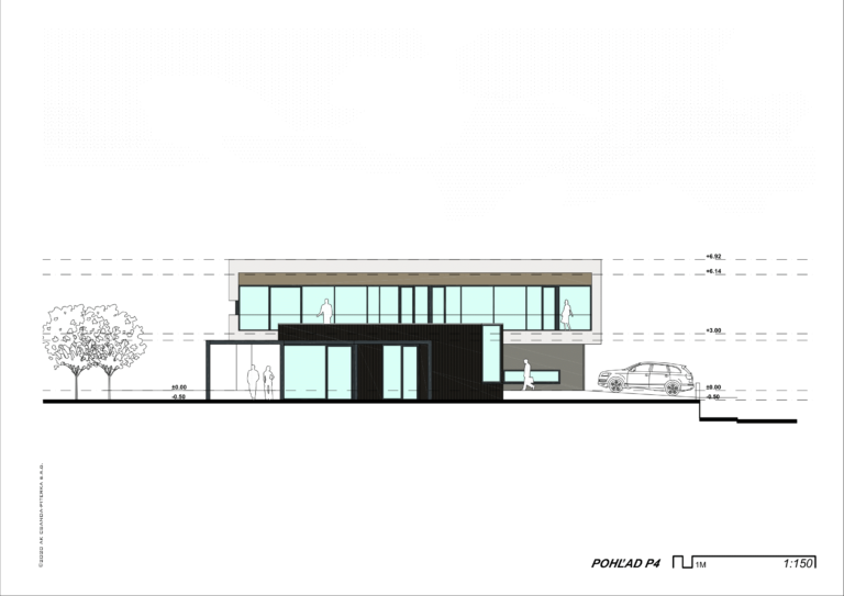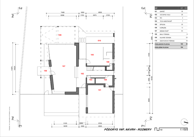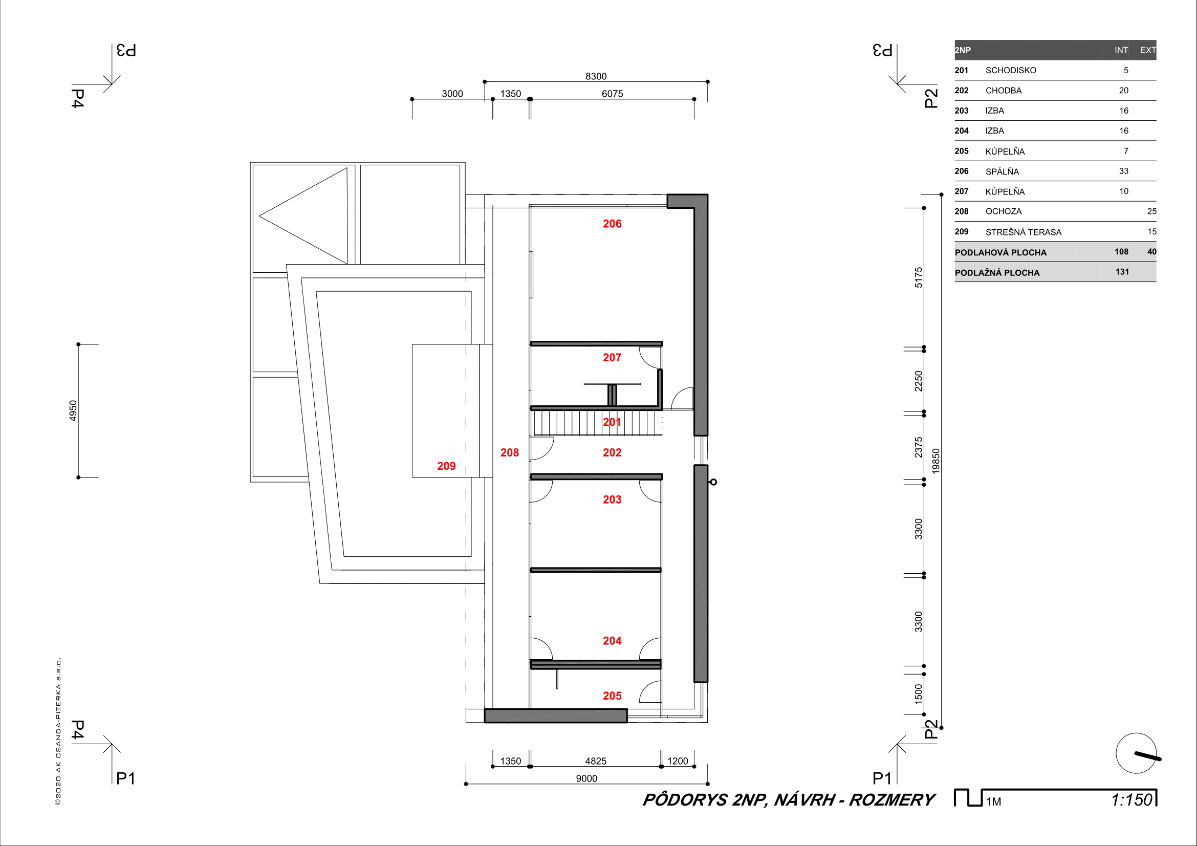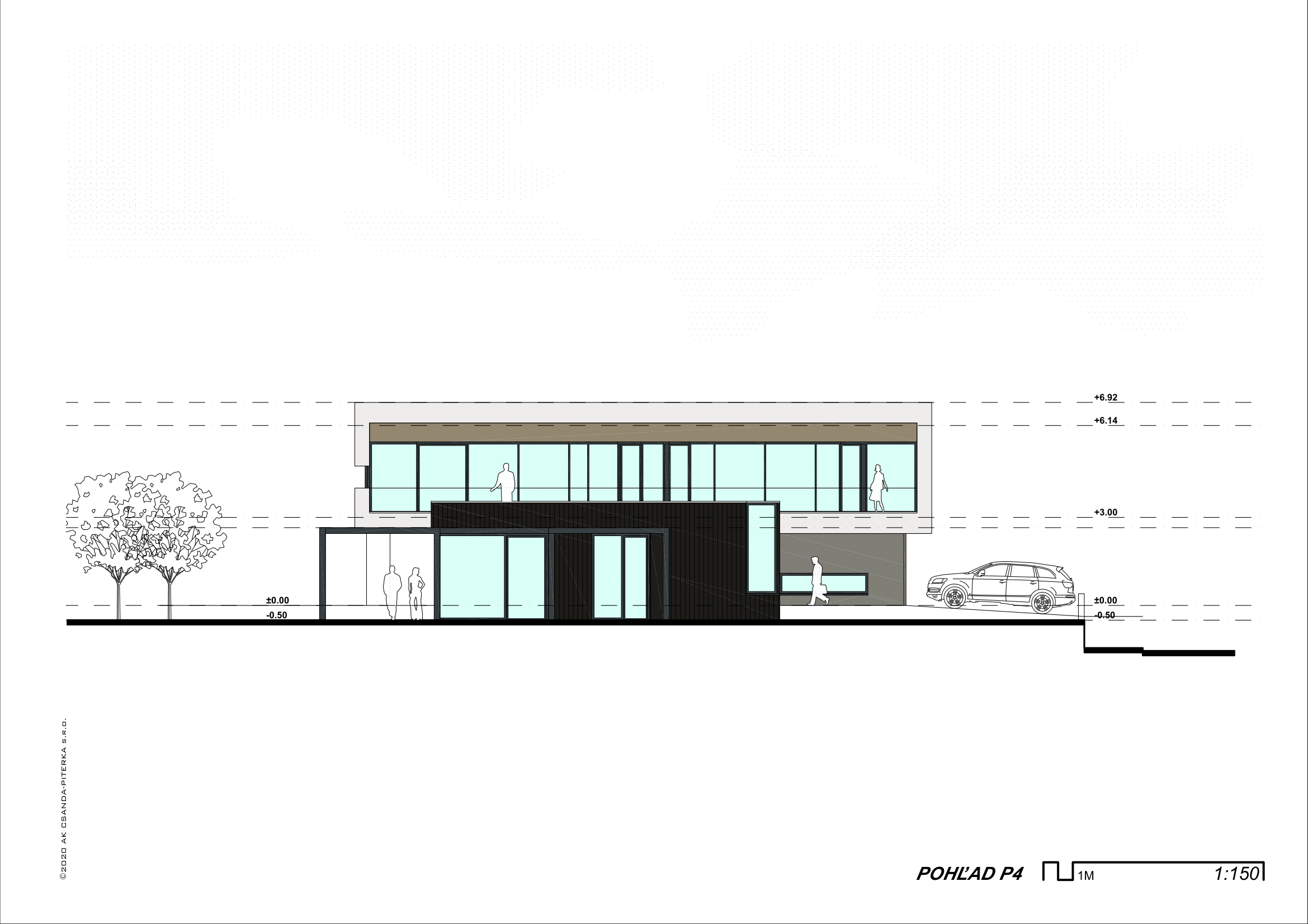 1NP domu je prístupné od ulice kde je aj parkovanie a vjazd do garáže. Zo vstupnej haly so schodiskom na 2NP je prístup do WC, tech. časti domu a garáže, Na opačnej strane je prechod do dennej časti. Z jedálenskej časti je vstup na malú terasu. Z obývacej časti je prístup na hlavnú-spoločenskú terasu. V závere haly je átriový vonkajší priestor, pred ktorým je vstup do spálne so samostatnou kúpeľňou a terasou. Na 2NP sa nachádzajú 3 izby a 2 kúpeľne. Z toho jedna spálňa so šatníkom a kúpeľňou. Izby sú Prístupné z chodby pozdĺž celej dispozície. Z každej izby je prístup na loggiu.