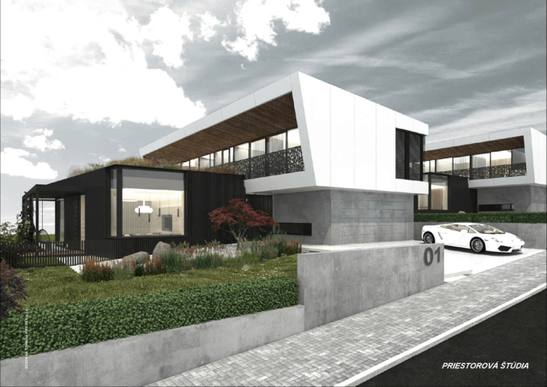 Rodinné domy sú dvojpodlažné objekty terasovito stúpajúce pozdĺž cesty. Tvar domu je vytvorený z troch hmôt, ktoré sú materiálovo odlíšené. 1NP je tvorené z hmoty dennej časti, ktorá je obložená fasádnym systémom vertikálnych lamiel a oproti ostatnej časti 1NP je posadená nižšie o 0,5m. Druhá časť tvorí podnož pre 2NP a je z pohľadového betónu. 2NP je obložené z dosiek alucobond. Zošikmenie jednej z fasád a strechy dodáva kompozícii dynamickosť a odpovedá na pôdorysné vytočenie steny dennej časti. Pôdorysný tvar dennej časti reflektuje možné výhľady na mesto. V súkromnej časti záhrady lemuje dennú časť pergola, ktorá prekrýva a zintímňuje priestory terás. Hmota 2NP prekrýva hlavný vstup od ulice, tak aj od záhrady ďalšiu terasu prístupnú zo spálne. Strecha dennej časti je navrhnutá ako zelená strecha s terasou, ktorá je prístupná z loggie pozdĺž celej dispozície 2NP. Loggia je orámovaná hmotou 2NP. Domy sú vyššieho štandardu čo je zrejmé z použitých materiálov (sklo, pohľadový betón, veľkoformátové obklady).